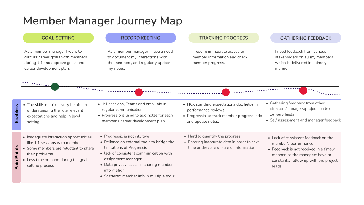 Through the journey Map that I created we were successful in identifying the challenges that the member managers were facing in different phases of member career development process. Goal setting, record keeping, progress tracking and gathering member performance feedback.