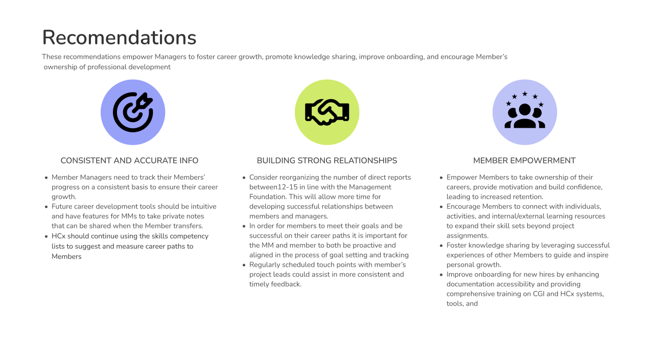 Our contextual inquiry research recommendations were a great starting point to think about automating the mundane tasks that managers have to do every week to perform their manager duties, like approving timesheets. Reducing the number of members each manger can manage to, 15 so that they have more time to support the members career development path by devoting time to one-on-one interactions and career guidance. Standardizing the process that mangers can follow to support the members on growth path at CGI and beyond. Create a vision and harmony, consistency, growth mindset and member empowerment at CGI.