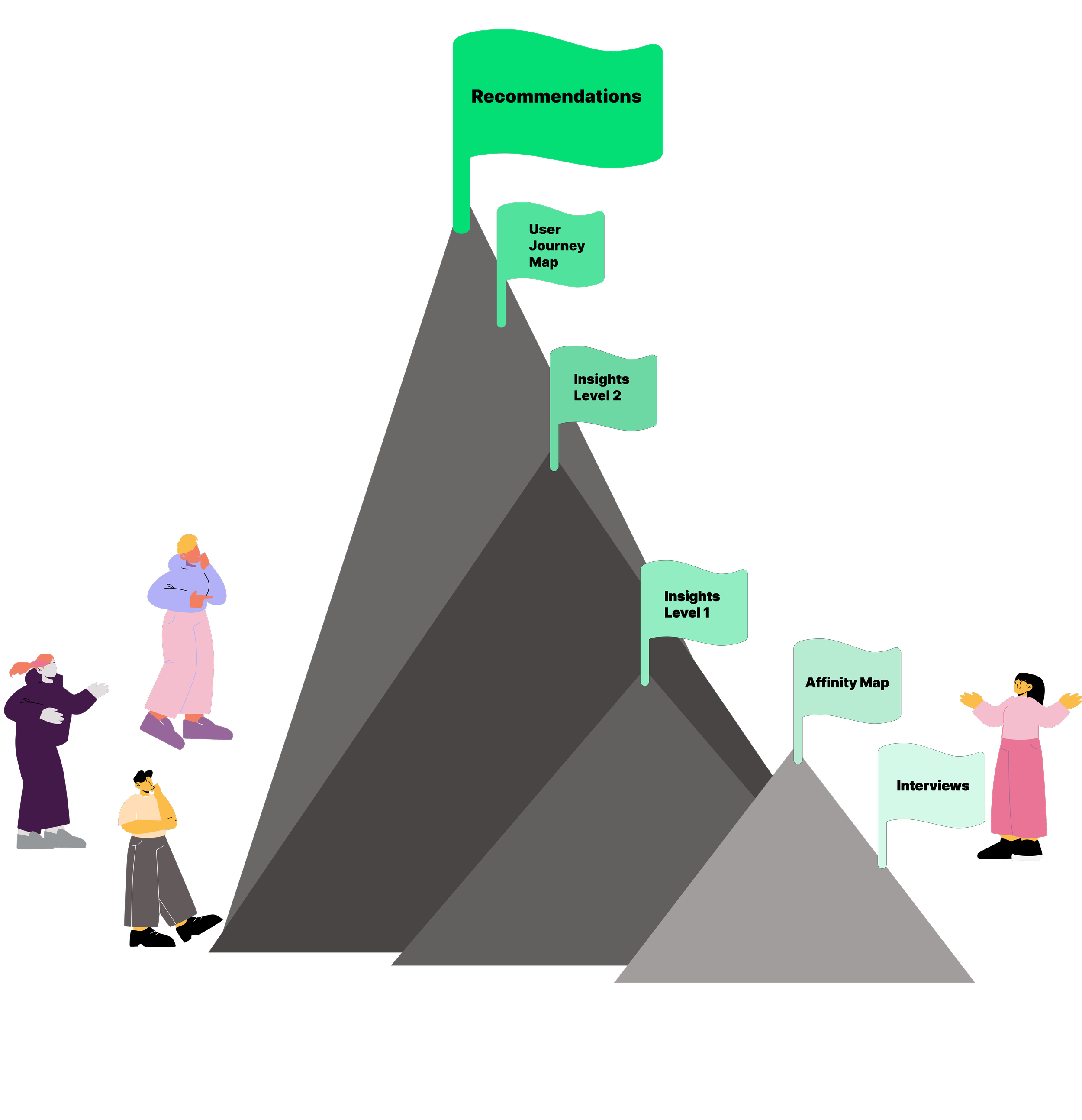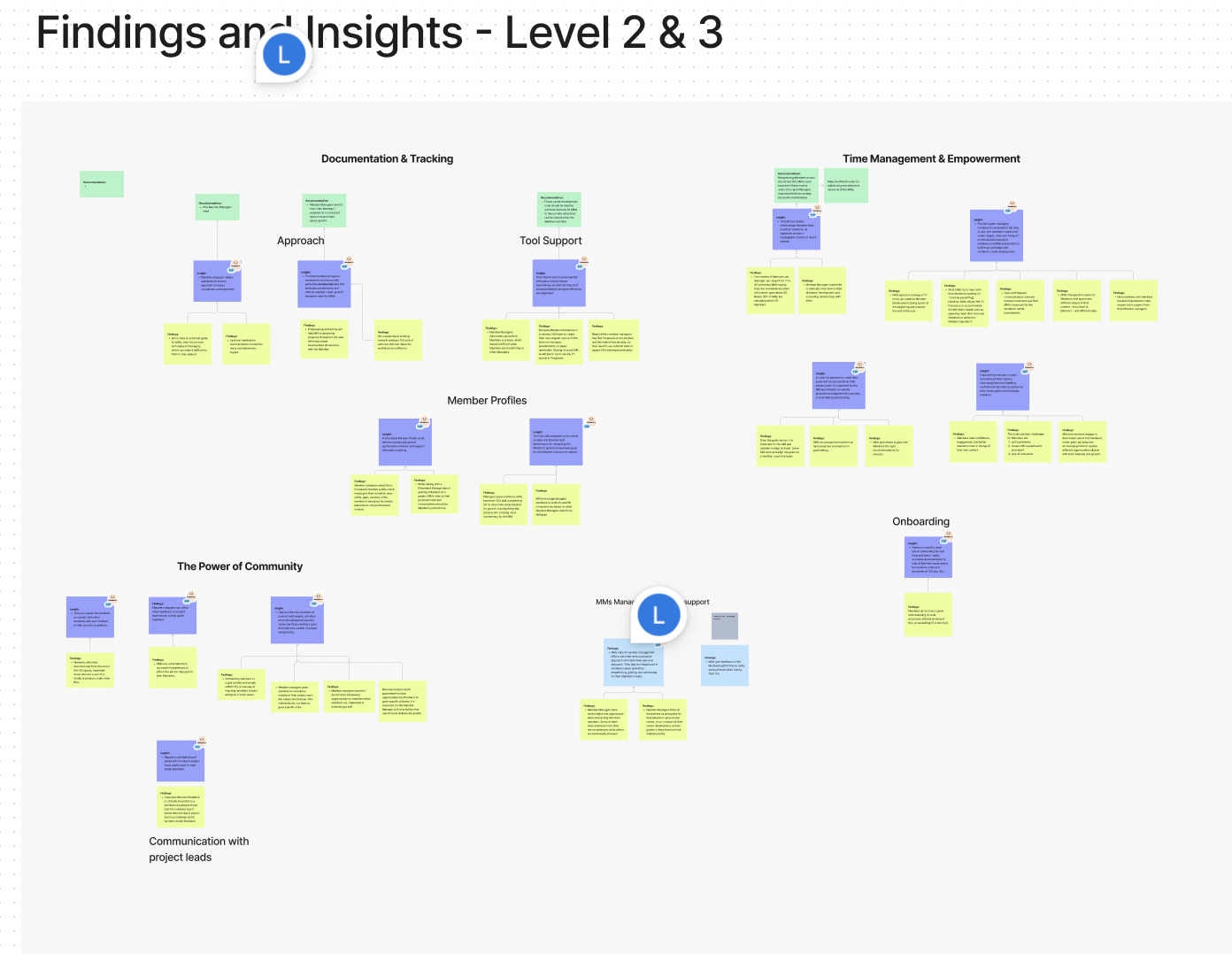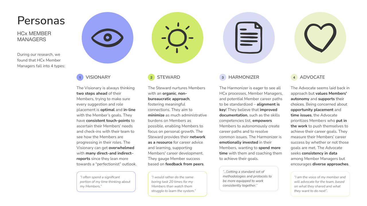 The team of four UX researchers conducted the contextual inquiry by interviewing seven directors from HCx division of CGI. We captured the notes in real time and organized them on a FigJam. The notes were arranged to look for pattern sin data and group the related data together in a an affinity map. The affinity map was leveraged to extract the first and second level insights. The actionable insights informed our decisions on generating personas and journey map. This led to the discovery of the major challenges that the managers face in members career development as well as the opportunities which informed the recommendations for best practice guide for managers.